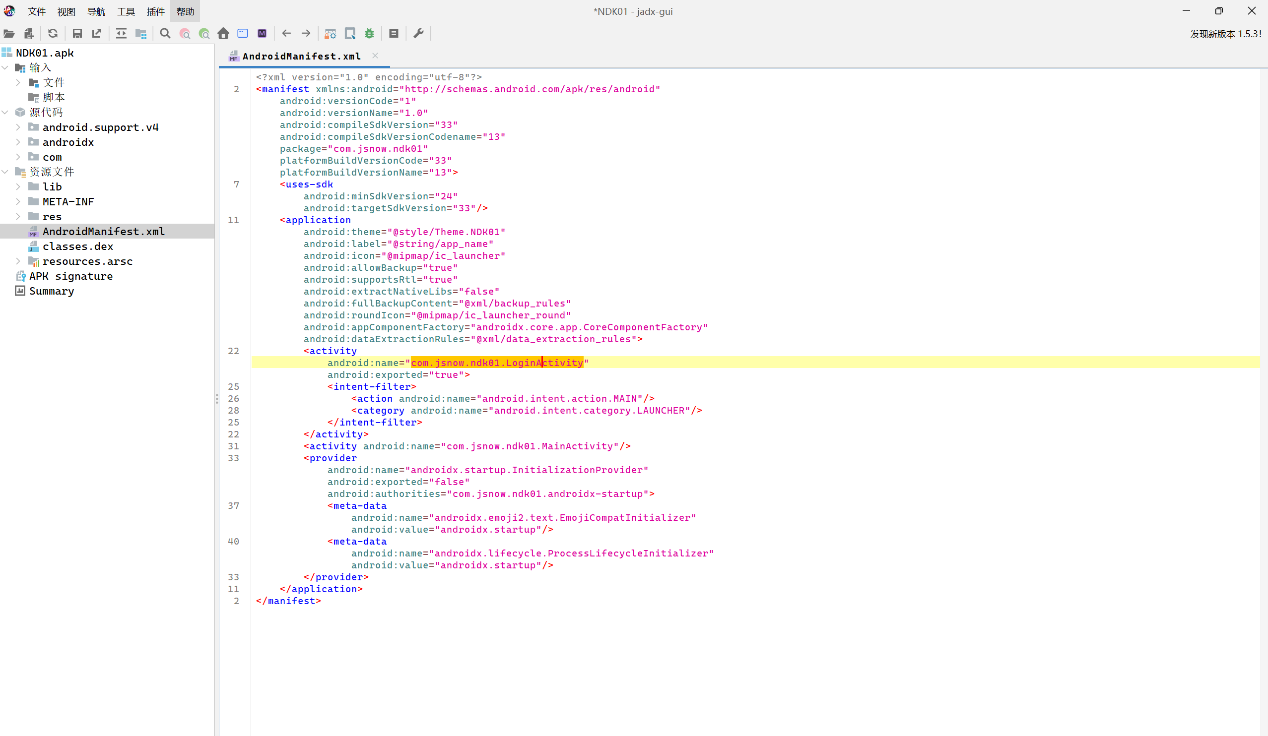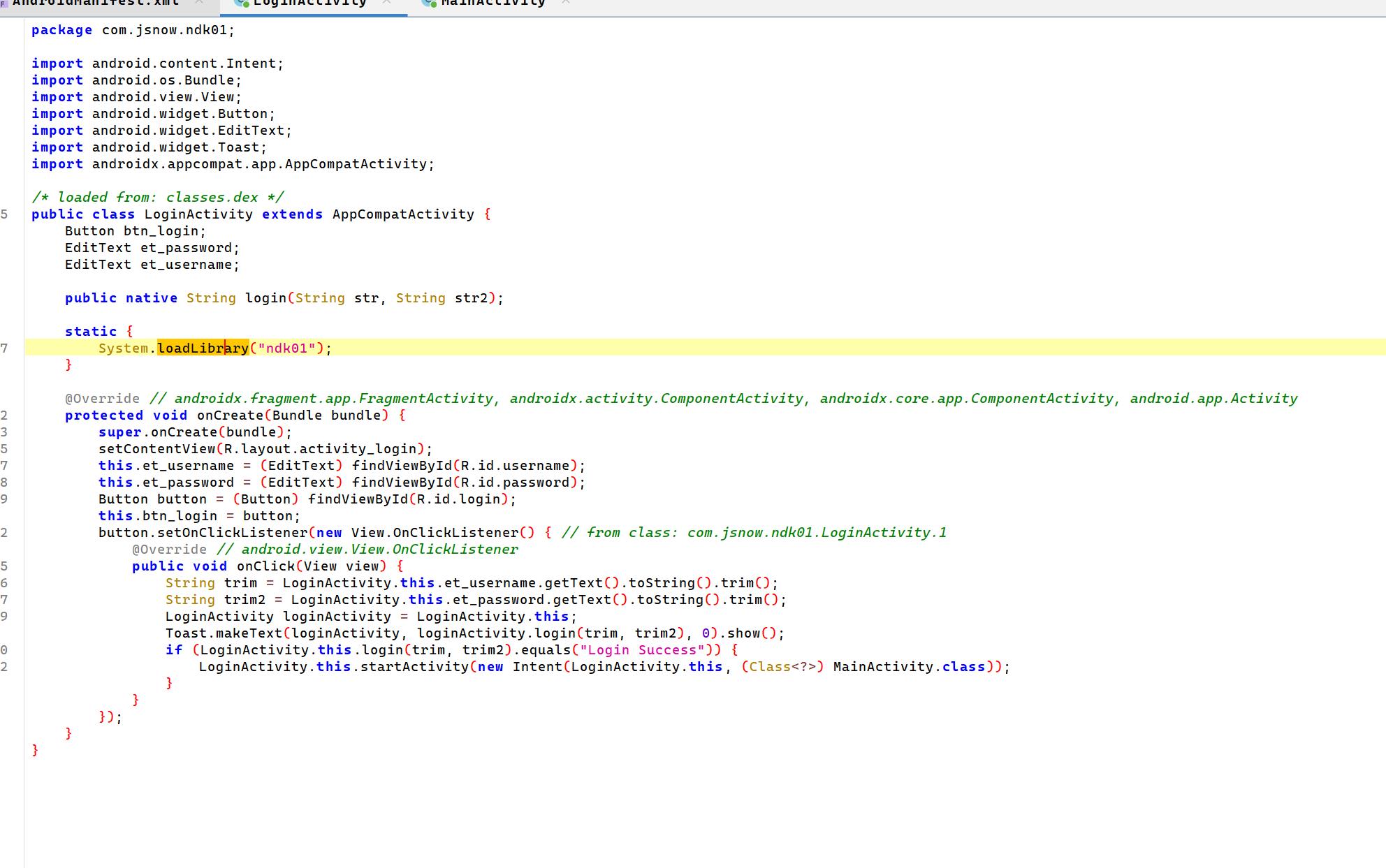 1,打开jadx,加载apk,我们发现LoginActivity,进一步寻找,发现lib文件ndk01。