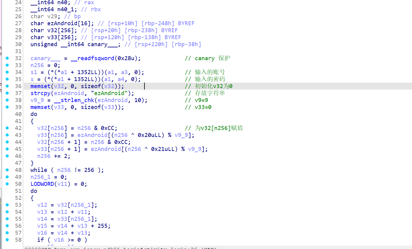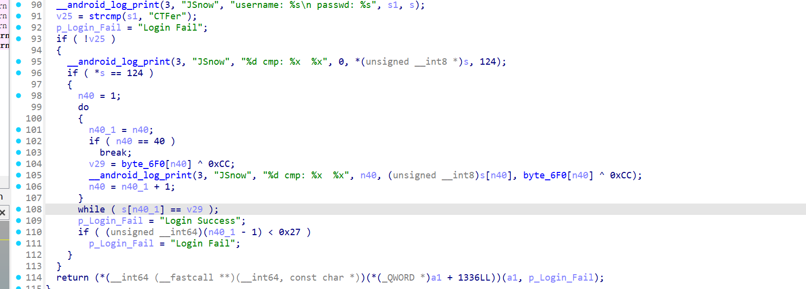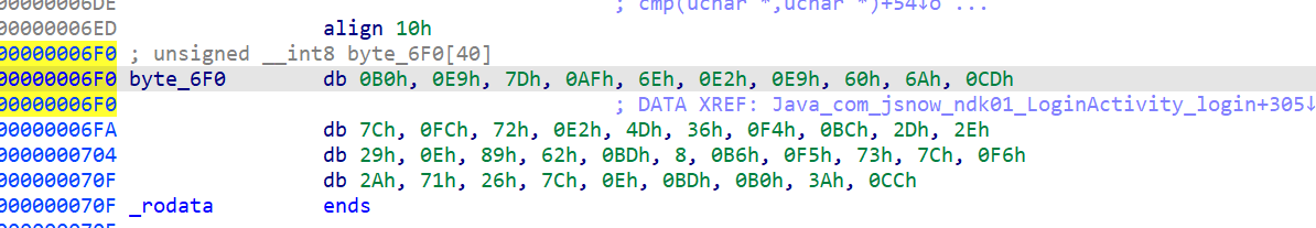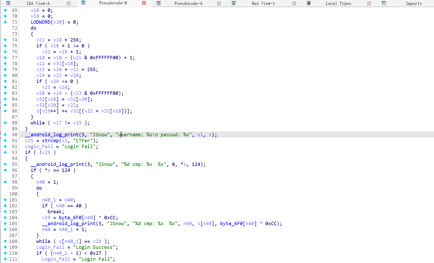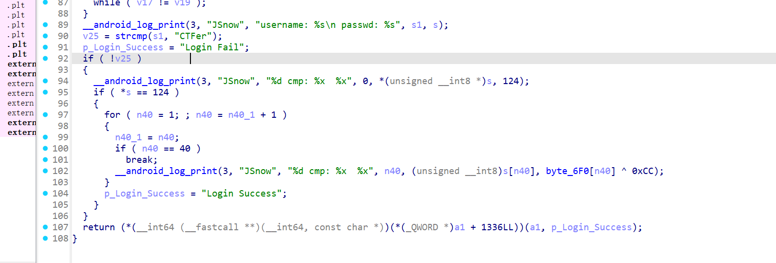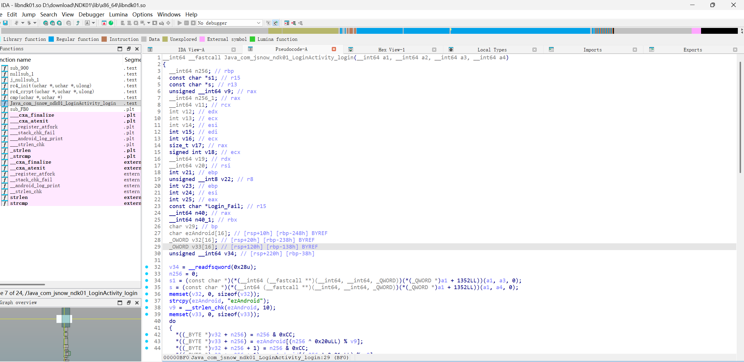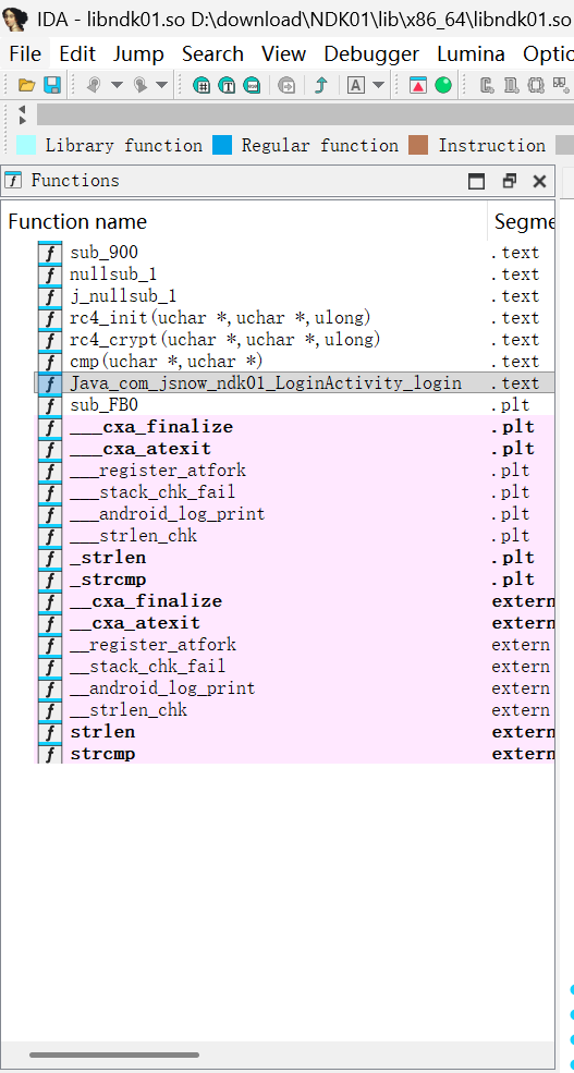 2,将apk更改后缀名后解压,得到libndk01.so,放进ida,注意到左侧的login,跳转翻看伪代码。