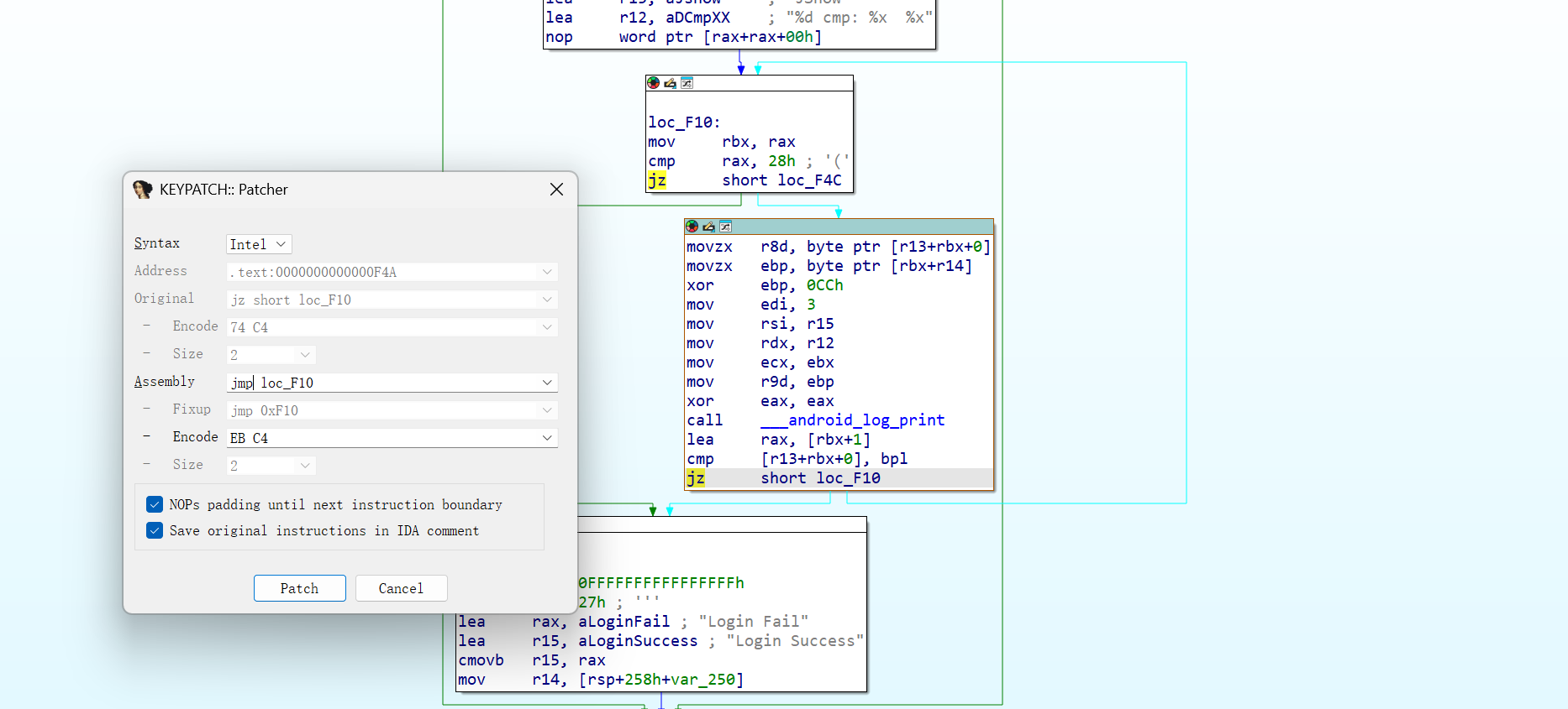 注意到程序的log输出循环中的这一判定条件,对应的汇编指令如图所示,我们可以将jz修改为jmp(恒成立)